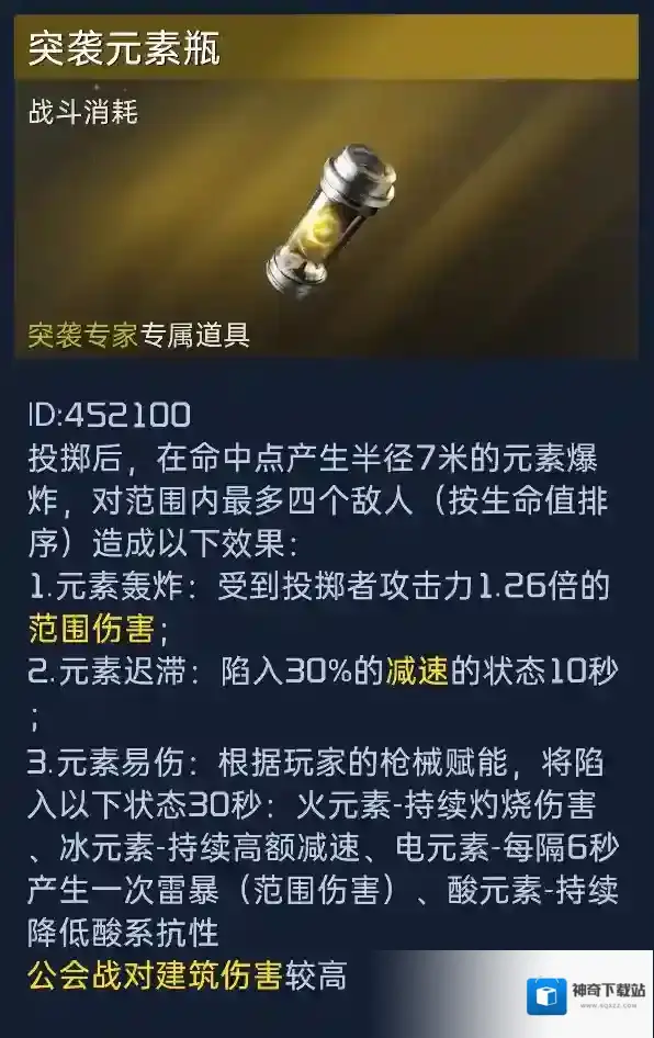 突袭专家精通赋能,可以投掷突袭元素瓶,元素爆炸!炸了的敌人不仅会受到高倍范围伤害,还会带上突袭专家的枪械赋能效果,陷入减速跑不动!