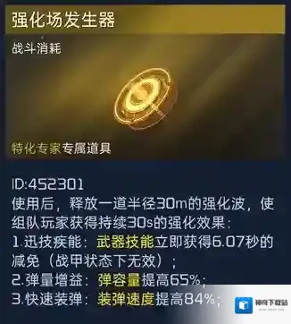 特化专家可以开启强化场发生器,接触到强化波,弹容量提高了、换弹速度快了、敌人武器技能减免了,这个feel倍儿爽!