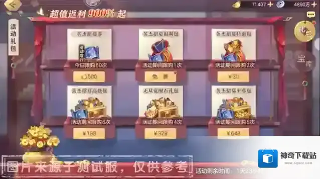 无双觉醒石礼包:内含无双觉醒石*6、元宝*3280,售价328元,活动期间限购4次。