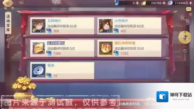 小将军们每次招募,必当额外获得「英杰宝珠」*60,在活动宝库中可兑换「王异碎片」、「小乔碎片」、「无双觉醒石」、「随机神将将魂」等奖励。