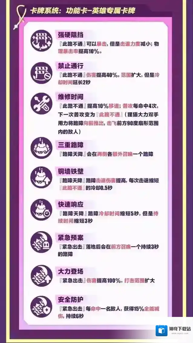 二技能“紧急出击”施展终极技能“路障天降”,狸猫大力吹响口哨,在目标地点召唤一个持续8秒的路障,砸飞范围内的敌人;触碰到路障的敌人会被弹飞并受到额外伤害。