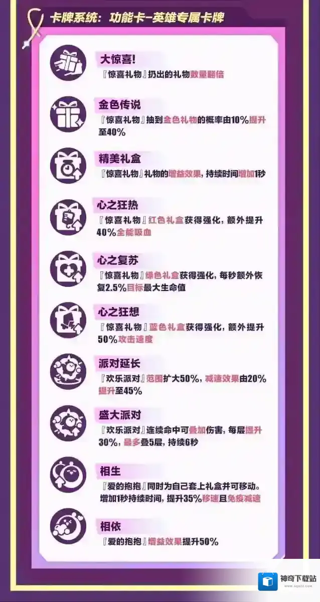 终极技能“爱的抱抱”超燃蛋仔“仔仔熊”专属卡牌同步上新,可以通过卡牌选择搭配出不同的战斗流派。如专注为队友提供援护,选择“心之狂热”“心之复苏”“心之狂想”强化增益效果,并通过“精美礼盒”增加礼物的增益持续时间;又或者选择“派对延长”“盛大派对”,通过增强减速能力与技能伤害,主动出击牵制敌人。