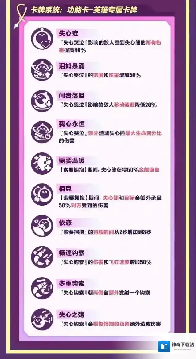 仔仔熊专属卡牌失心熊战斗指南失心的痛苦化作对敌人的无畏,破碎的糖果也能是作战的利器。全新超燃蛋仔“失心熊”拥有普攻击退、技能钩拽、甚至是令敌人无法行动的强制控制效果,更兼顾了不容小觑的伤害能力。