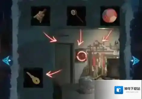 14、将靠旗插在仓库桌子的靠旗背包中,拾取布老虎。将布球、拨浪鼓、布老虎全部摆放到神龛上拾取钥匙。