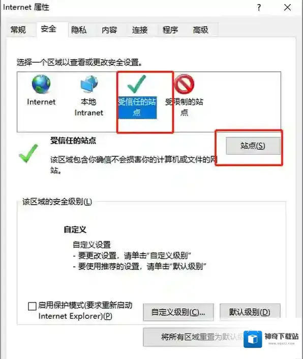 5、可以看到“选择区域以查看或更改安全设置”的区域,需要点击第三个“受信任的站点”,然后点击右下角的“站点“选项。