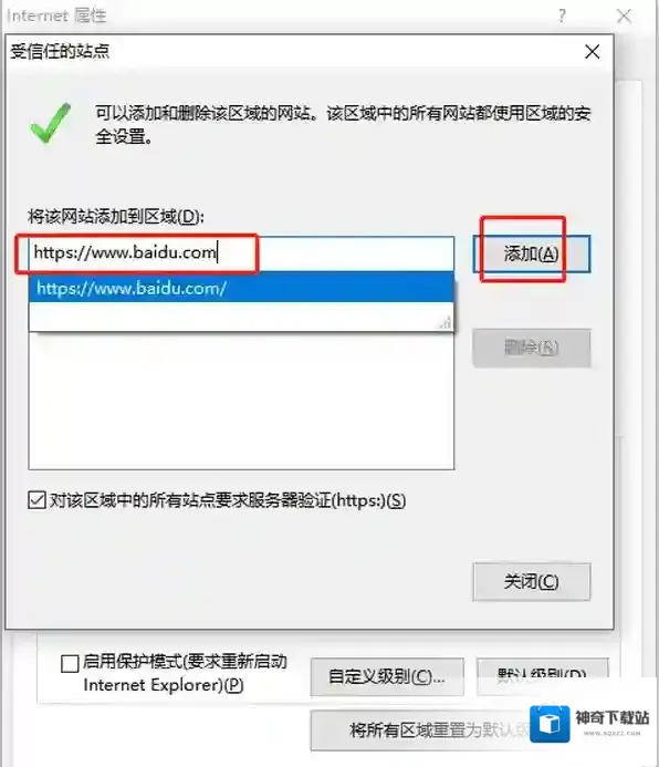 6、此会弹出一个可信任站点的添加窗口,点击右侧的添加,就能够输入需要添加的白名单网址了。