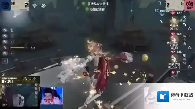 第三天,Gr vs成都GG第一局下半场,Gr_Jin“喧嚣”在湖景村大船船头将守墓人淘汰后,移形去追击GG_ppz弓箭手,GG_ppz利用臂弩命中监管者后再使用飞轮规避双重惊喜的两层标记,顺利进入板区,“喧嚣”空中飞人跟上距离,火速施加粘土标记,在弓箭手转入小木屋前成功拿到一刀伤害,而后再次使用双重惊喜将其击倒上挂,而后直接赶往中场守遗产机。GG_18木偶师也在此期间成功将海边密码机补开,待监管者离开后将弓箭手救下。Gr_Jin利用空中飞人快速贴近中场,远程操控分身成功对GG_ppxia气象学家附上两层惊吓标记,通过对舞台的精准把控在板间快速将其击倒,接着去将木偶师逼离中场,仅用10秒便使其状态仅剩四分之一,然后使用移形回防气象学家和弓箭手调整状态,仅用4秒再次将气象学家击倒,利用移形返程,远程释放分身精准定位木偶师,自信回头出刀附上干冰标记,与之前还没消散的惊喜标记叠加触发伤害将木偶师击倒并上挂,最后收割弓箭手,顺利拿下四抓。Gr_Jin从开局击杀守墓人,到两次守椅均成功追到双倒,再到围绕最后一台密码机的拉扯,每次出击都在电光火石间爆发,打对手一个措手不及,风格强悍得让人望而生畏。