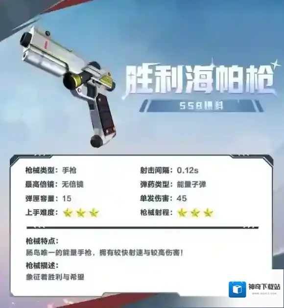 「胜利海帕枪」是目前肠岛唯一的能量手枪!射击模式可以在自动模式与单发模式间切换~