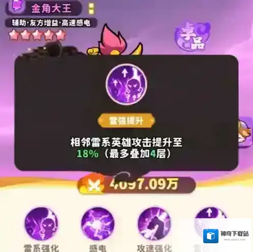 潜能爆发:提升自身攻击,同时强化相邻雷系英雄攻击,是团队辅助技能,可增强自身及身边雷系队友的输出,构建小范围雷系增益区域,提升团队作战能力 。
