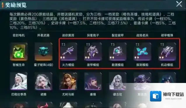本卡池中可以抽取大量兵种模组,每一个兵种等阶总体战斗力对比上一阶提升幅度超过100%以上。举例,T6是T5的200%,T5是T4的200%,T6对比T4提升超过400%。