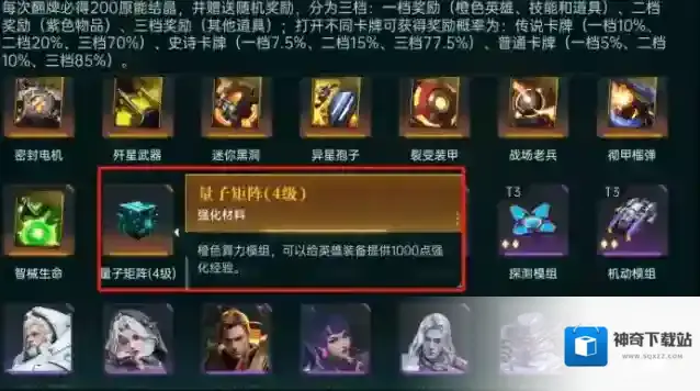 依然可以抽取经验药剂、原能结晶和量子矩阵,用于提升装备等级、英雄等级和技能等级,提升战斗力,爆率与大卡池无异。注意该卡池还会产出4星量子矩阵,能大幅提升装备等级。