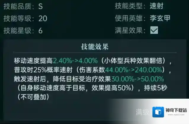 (2)移速提升:完美适配李玄甲,全满星提升达到12%/24%(非小型/小型),白板提升也有4%/8%(非小型/小型),能极大程度提升军团的机动性,同时十分契合李玄甲移速高过目标时的增伤效果。