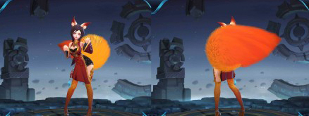 以上五个模型的出场动画都是一样的,参考原皮魅力之狐的出场特效即可,而妲己的热情桑巴暂时没有优化。除了上述指出的优化内容外,模型的细节表现也更强了,从毛发上就可以看出,新模有细小的发丝,旧模整个就是一坨,这次优化还是挺给力的。