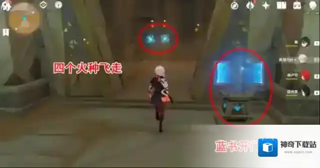 5、接着看到一本蓝书,交互后打开大门,看到四个元能火种飞出来,还有个华丽宝箱,先不管宝箱。