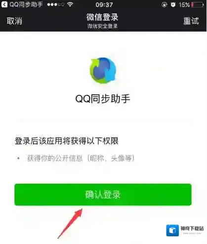 7、进入“qq同步助手”主页面,点击右侧绿色按钮,进行登录;