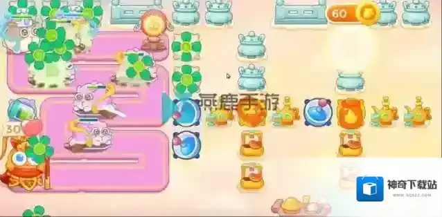 6、神仙来了,在左上买齐风扇,火炮是主力输出,遇到镜子和钉子都打掉,左边路边买雷达,除了打神仙技能,一直打神仙,遇到仙女兔锁定。