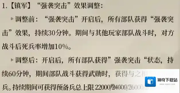 强袭突击调整后:60分钟内只要打3w+武勋,就能多出3w预备兵,适合高战玩家选择。
