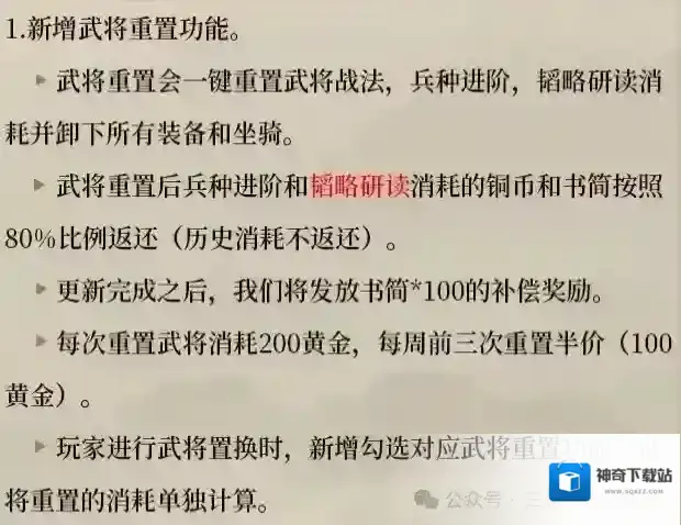 武将重置:单个武将重置战法、兵种、韬略,卸下装备、坐骑,重置后武将战法升级、兵种进阶、刷韬略消耗的所有铜币和书简按照80%比例返还。