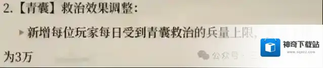 原本青囊可以绑定盟内氪佬上救治,或者只给自己的队伍上救治,调整后就不能这么玩了,因为每人每天救治兵力上限只有3w,再多的话救治就不能生效了。
