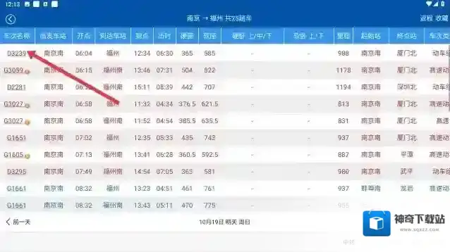 4、完成所有信息设置后,点击查询按钮,即可获取对应出发站到目的站的车次信息,能查看出发车站、开点、到达车站、到点、历时、票价、里程等详细内容。