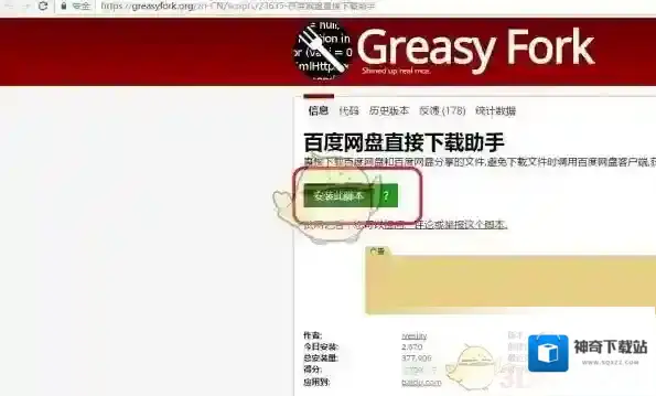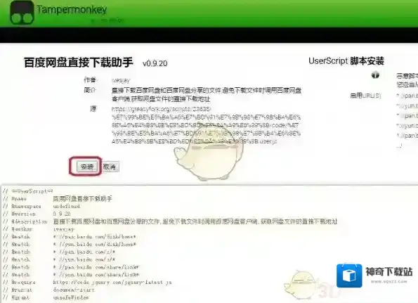 7、打开网址https://greasyfork.org/zh-CN/scripts/23635-百度网盘直接下载助手,点击安装此脚本,等待弹出对话框后点击安装即可把下载助手安装完成。