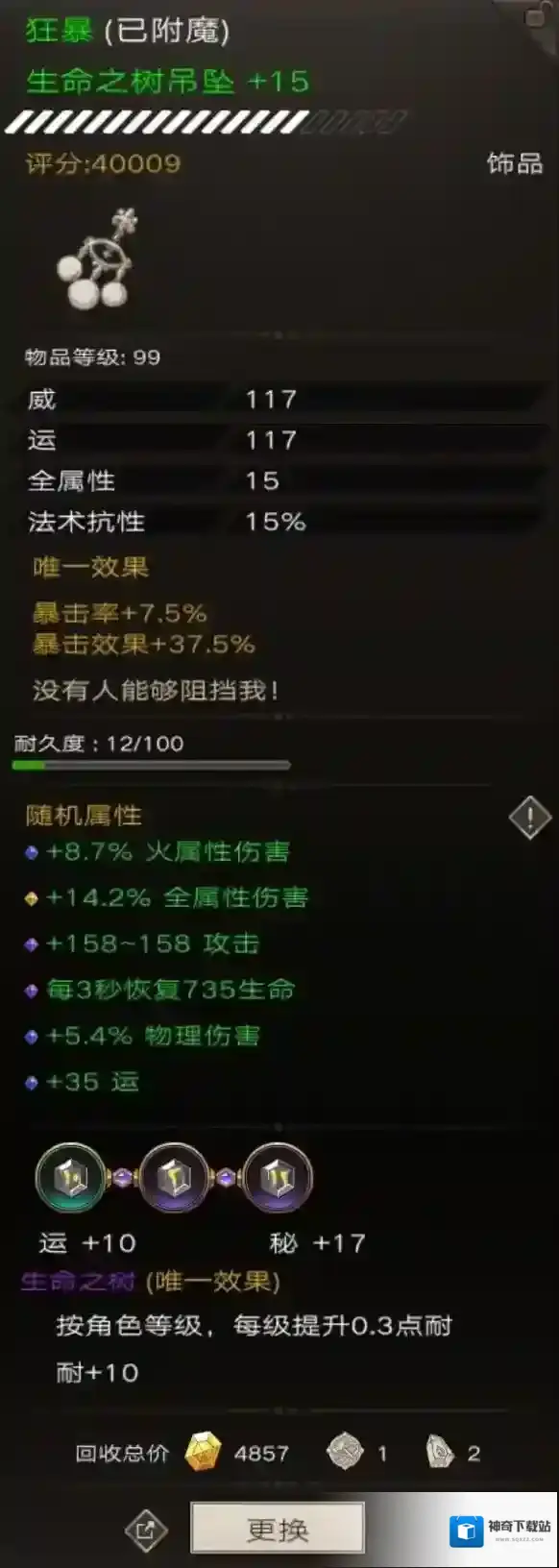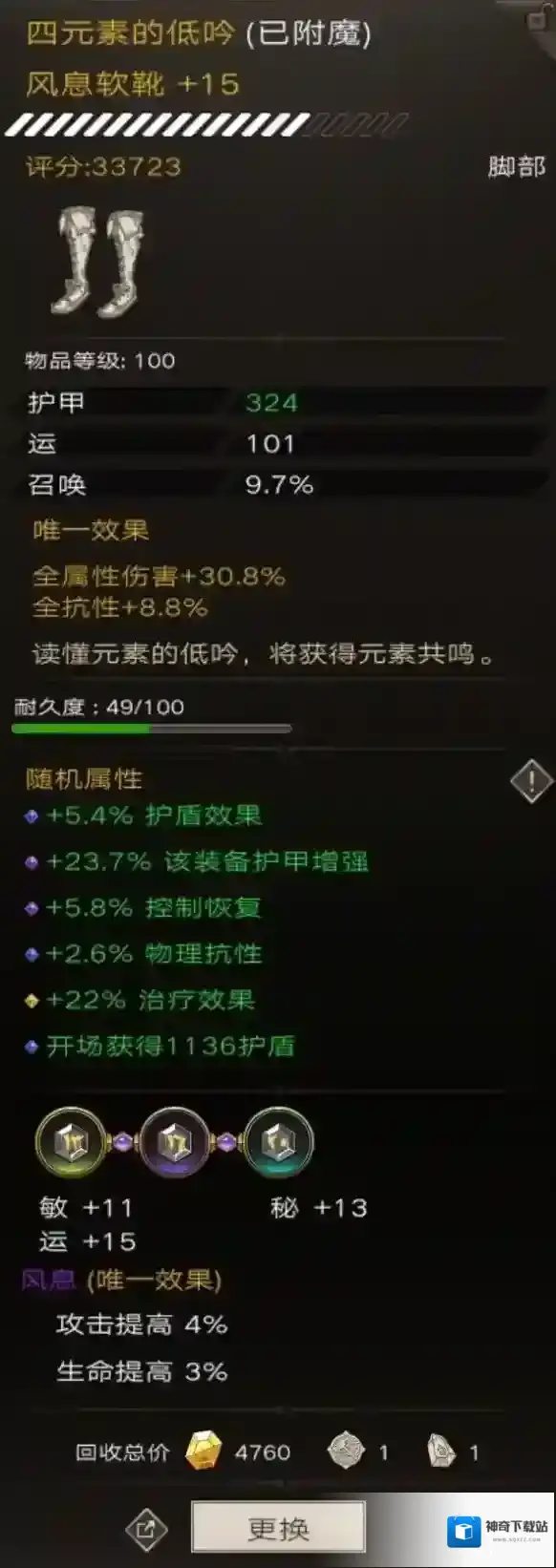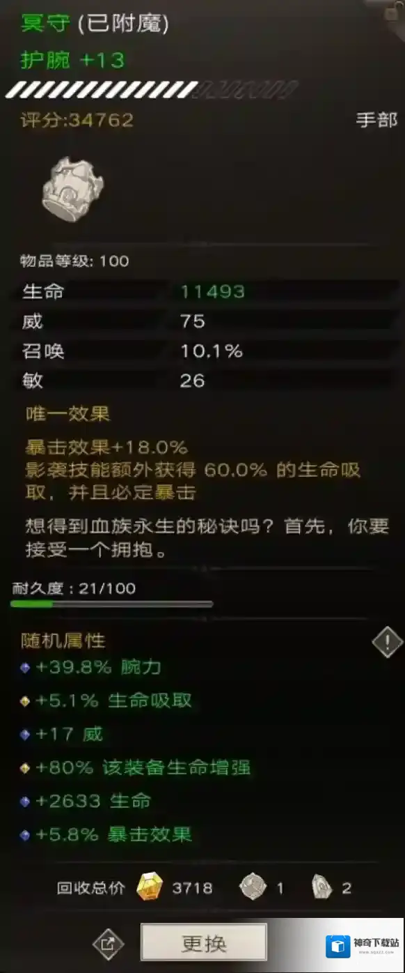 随机属性该装备攻击增强其实可以洗到100%的,奈何我脸黑洗了将近1000个遗忘之魂还是没有洗到。