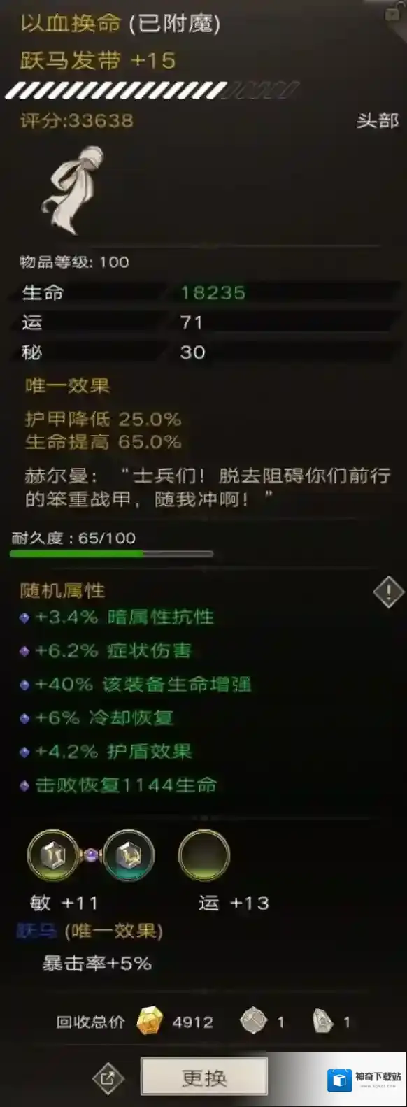 上图以血换命是搭配泰坦最好的一个词缀,生命直接增加65%最大值增加85%但那是红装的事情了。大家可以注意看我这个装备的基础属性加的是运而不是耐,所以说我是个盗版泰坦。