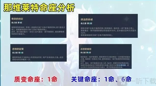 那维莱特的一命无疑是质变命座。登场时自带一层天赋,并且重击时自带相当于霸体的抗打断。可以说这个命座大幅度解放了那维莱特的配队,自带一层天赋意味着可以少触发一种反应,而自带抗打断就可以不用依赖钟离等盾辅。解放配队后,那维莱特就可以带更多的增伤辅助,来进一步提升伤害。