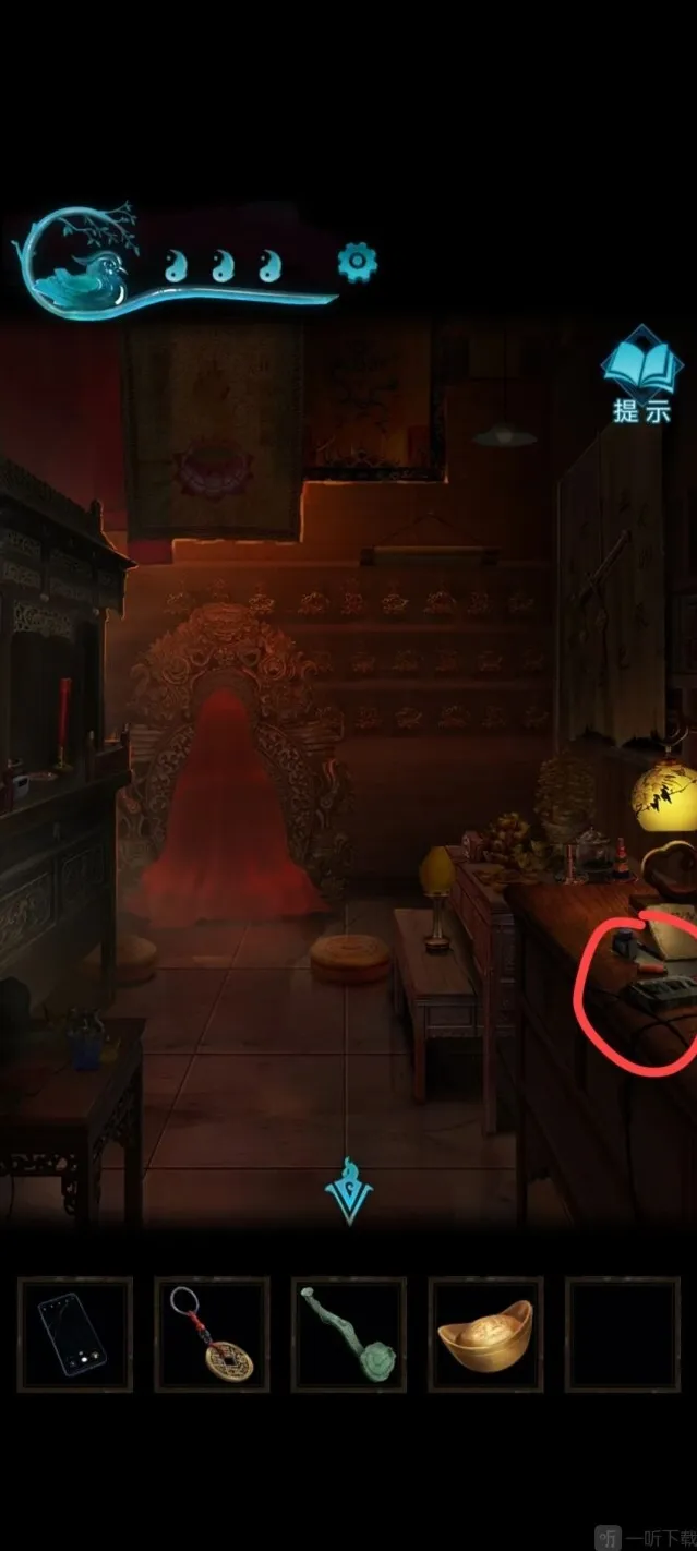 9、之后来到易寿堂旁边的屋里,六宝阁, 进去后关掉桌子上的电源,之后电源旁边有打火机,记得看那个电源旁边的书
