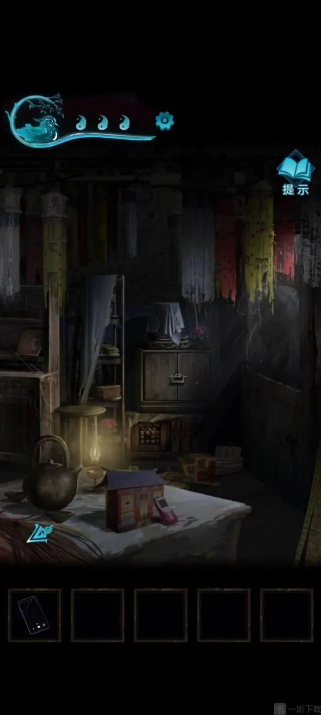 打开山洞里刚才的房间,进去先翻柜子,得到一只珍珠耳环,知道了莫琪的事。再用老婆的手链把胶带扯开,打开得到神像和蜡烛。