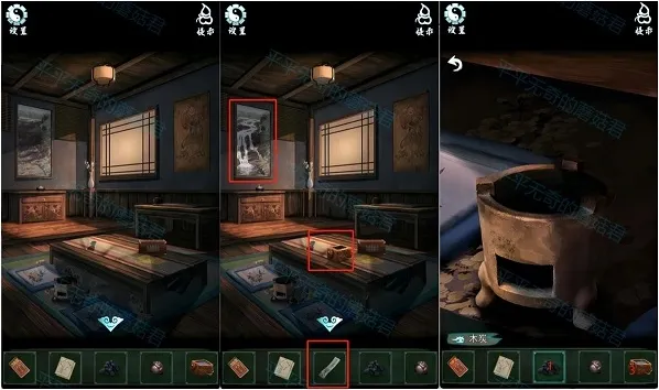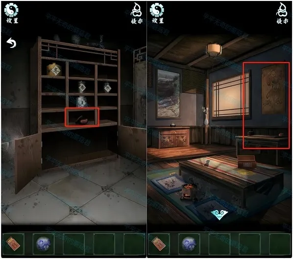 六、然后要钥匙打开茶房,点击第一张图屏风位置,获得密码3957打开下图柜子的密码,获得木炭,再点击中间图位置的图片位置,或者密码左右左左右左,解开福字的门锁,获得茶宠,茶宠,是放入倒满水的被子中