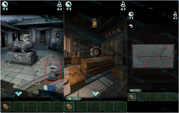 十二、之后来到院子之中,点燃其中的石灯,然后根据石灯亮起的顺序,按压正屋之中箱子的密码锁。然后获得灯笼。