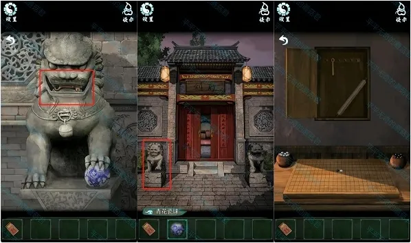 十、之后带着青花瓷球,来到门口,放入左边的石狮子爪子下,获得钥匙,打开上一步对弈后烧毁的画后的柜子里。得到正屋的钥匙跟一幅画,后面会用到。