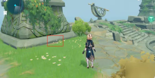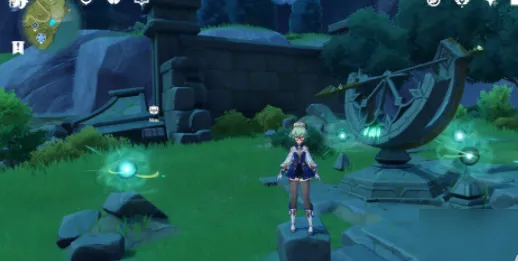 6、进入风场追上狂风之核来到了千风神殿附近,将时间调至凌晨2点,然后打开元素视野会看到日晷附近有4处风球,使用风元素将它们吹散。