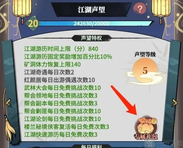 江湖声望5/10/15/20,专属礼包,可购买礼包,礼包内含掌门本体自选宝箱。