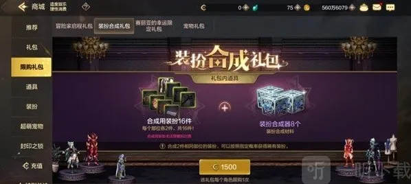 合天空的时候可以先去商城限购礼包区购买一个装扮合成礼包,价格是1500点劵,里面包含16件不可穿戴不可出售的高级时装和8个装扮合成器,总共可以点8次,先去合成看看能出几件