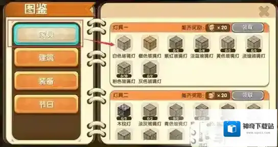 在图鉴里面找到家具一栏,就能找到淡蓝玻璃灯。