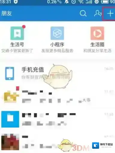 5.再回到支付宝,点击朋友,然后点击右上角的+号,会弹出来添加朋友选项。点进去。