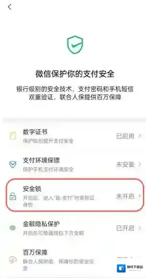 4、找到安全锁一项进入,为支付页面设置安全密码锁;
