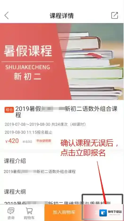 三、登陆后,进入“选课中心”界面,先选择所在年级,暑假开学后上几年级,就选择新几年级,例如:暑假后开学要上初二,选课时年级就选择新初二。最后确定需要报名的课程,点击“立即报名”。