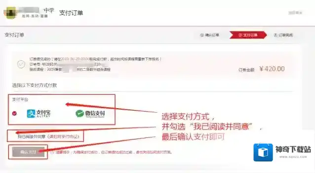 五、再次确认订单无误后,选择支付方式,勾选我已阅读并同意《课后网支付协议》,点击左下角的“确认支付”按钮。