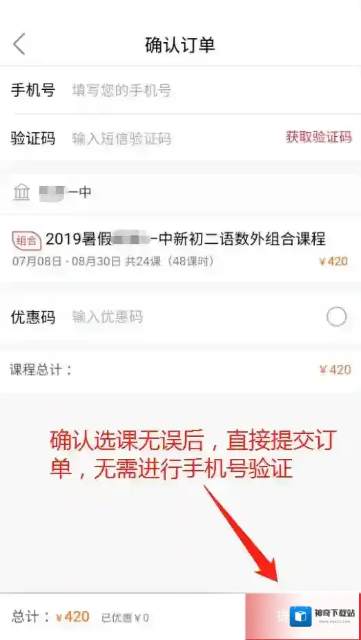 四、确认所选课程与所在年级相符后,直接点击右下角“提交订单”按钮。联系方式、验证码信息无需填写。