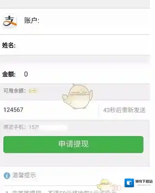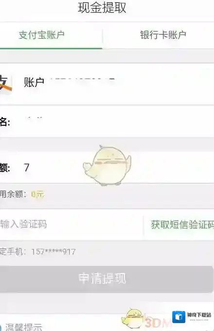 2、现在就来到了现金提取页面,软件提供了两种提现方法银行卡提现和支付宝提现,银行卡提现的话就是输入你的卡号、姓名、提现金额。然后输入手机验证码进行提现这里就不做详细介绍,下面讲解一下支付宝提现的方法,单击”支付宝帐户“。