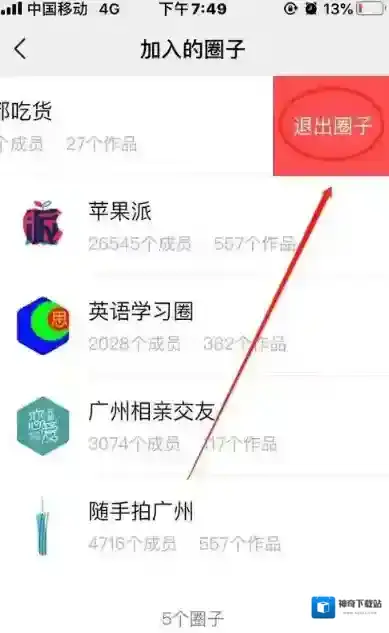 5、然后将我们想要退出的圈子左滑,点击页面上的“退出圈子”。