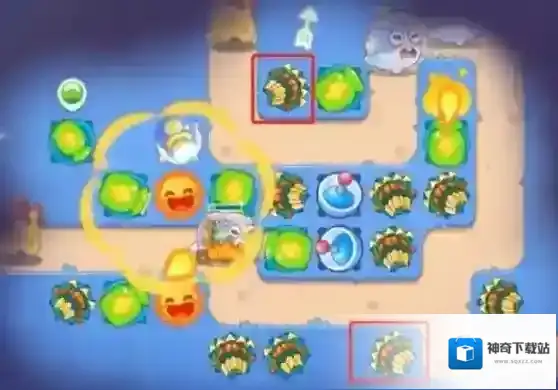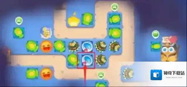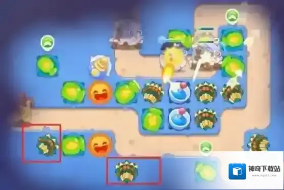 5、第五、六波上方加一瓶子塔,左侧加一鱼雷升满级,左侧再加三瓶子塔,中间加一蓝色塔,道具全清。