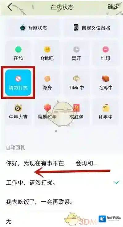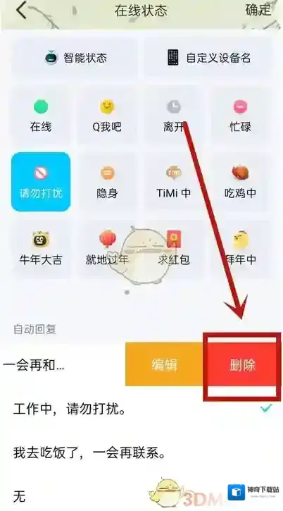 5、任选状态为离开、忙碌、请勿打扰,选择想要删除的自动回复并左滑,