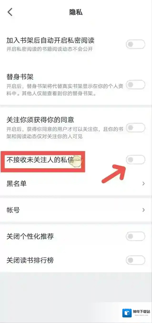4、在隐私页面,点击开启“不接受未关注人的私信”即可。