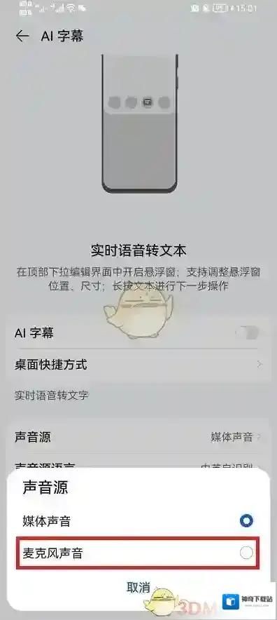 5、在不同的场景使用下,切换不同的声音来源就可以完成实时的字幕翻译,如果看电影时无法翻译就切换成为媒体声音,如果是语音通话就切换成为麦克风声音,就可以避免识别不了的问题。
