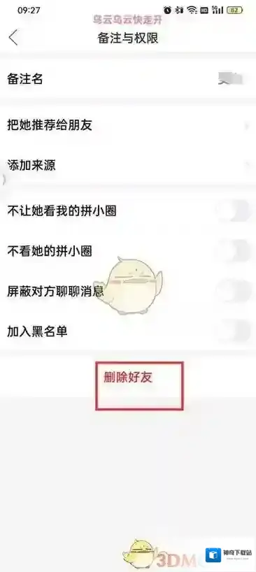 5、最后在备注与权限的页面中点击删除好友即可。