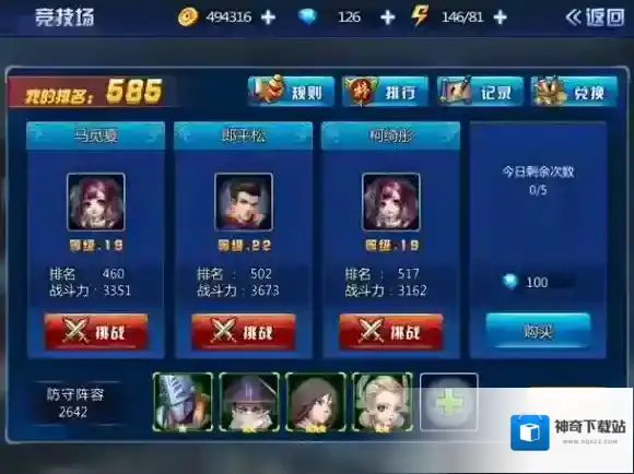 竞技场对战可获得大量钻石,竞技场采用自动战斗模式,玩家不需要手动释放技能,战胜高于自己排名的玩家可以获得钻石奖励,每日都会根据排名发放钻石奖励,玩家每天可以发起5次挑战,VIP玩家可以购买挑战次数。